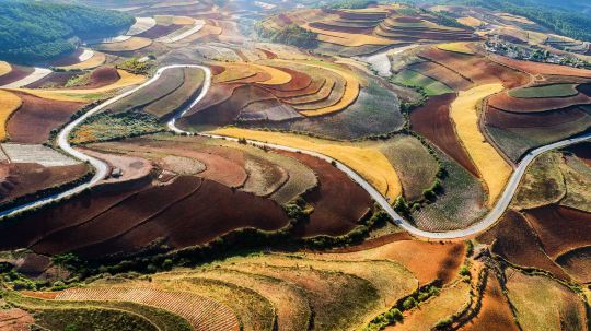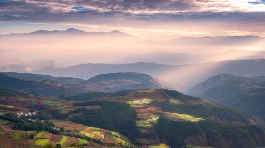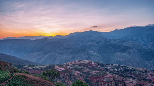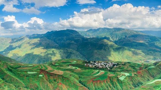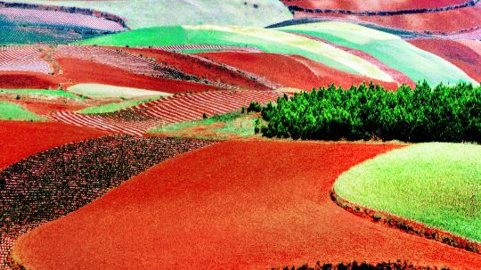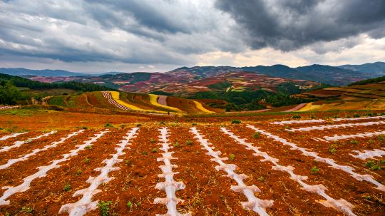 东川红土地位于昆明市东北,因土壤里含铁、铝成分较多,就形成了炫目的赤红色彩。土地被田地和农作物分割成一个个色块,远远看去,五彩斑斓,衬以蓝天白云,更为壮观。这几年,红土地逐渐成为了摄影爱好者的天堂。