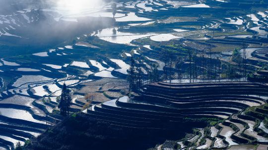 多依树景区包括多依树、爱春、大瓦遮等连片上万亩梯田,像版画一样连绵壮观。尤其是日出的时候,朝阳的光辉在梯田水面上跳跃,变幻出多样的色彩。