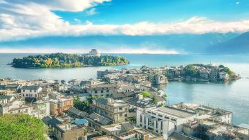 洱海位于大理古城东侧,青葱的苍山脚下,湖泊蔚蓝,以山水美景和独具风情的各个村镇而闻名于世,是大理四大名景之一。