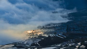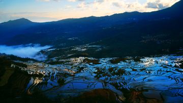 元阳梯田位于云南省元阳县的哀牢山南部,是哈尼族人世世代代留下的杰作。元阳哈尼族开垦的梯田随山势地形变化,因地制宜,坡缓地大则开垦大田,坡陡地小则开垦小田,甚至沟边坎下石隙也开田,因而梯田大者有数亩,小者仅有簸箕大,往往一坡就有成千上万亩。元阳哈尼族梯田生态系统呈现着以下特点:每一个村寨的上方,必然矗立着茂密的森林,提供着水、用材、薪炭之源,其中以神圣不可侵犯的寨神林为特征;村寨下方是层层相叠的千百级梯田,那里提供着哈尼人生存发展的基本条件:粮食;中间的村寨由座座古意盎然的蘑菇房组合而成,形成人们安度人生的居所。这一结构被文化生态学家盛赞为江河——森林——村寨——梯田四度同构的人与自然高度协调的、可持续发展的、良性循环的 元阳梯田日落生态系统,这就是千百年来哈尼人民生息繁衍的美丽家园。元阳的梯田景观是有最佳观赏拍摄时间的。一年中最好的季节是11月至次年4月间,这时候田中无稻谷,水平梯田层层透亮,光影效果极佳,其中春节前后更是经常可见云海,元宵前后,野樱花、野木棉花、野桃花和棠梨花开得满山的红、白色,极为壮观。早晨最佳拍摄点是多依树景区。当太阳呈逆光角度驱散晨雾,层层梯田便渐渐染上金光,坐落其间的哈尼族彝族山寨,被云雾掩映得扑朔迷离,如诗如画,如梦如幻。坝达和勐品的老虎嘴景区,则是观日落的必到之处。在斜阳和彩霞的映照下,连片的梯田就像是浩瀚的大海,雄伟壮丽,各种有节奏的层次和美妙曲线,五彩斑斓的颜色搭配,常让人目瞪口呆,不知身在何处。老虎嘴离视线最远处的左上角,细看还可看到一匹正扬蹄奋疾的骏马!其他如箐口、龙树坝、攀枝花的螺丝田等,也是各具特色,绝不容错过。