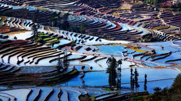 多依树景区包括多依树、爱春、大瓦遮等连片上万亩梯田,像版画一样连绵壮观。尤其是日出的时候,朝阳的光辉在梯田水面上跳跃,变幻出多样的色彩。