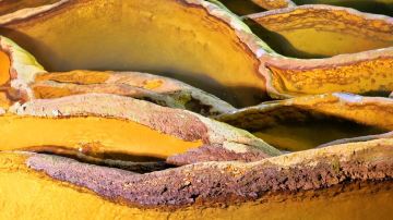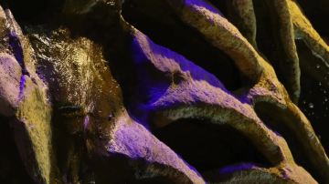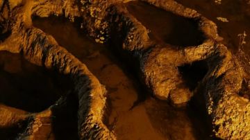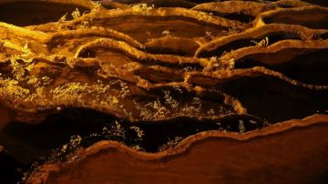 山路的侧面,钟乳凝石层层叠叠,汇聚成梯田一般,在灯光照耀下,美轮美奂,这就是传说中的“神田”。神田之间有一块巨型圆锥状钟乳石,据说就是粮仓,看起来果真颇为相似。