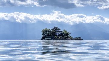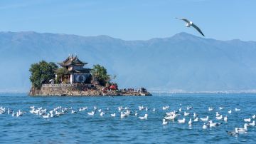 岛上可参观的地方较少,更多游客还是选择在岸边给小普陀拍照。晴天时,苍山洱海都在背后,一座小岛和楼阁独立湖中,画面奇幻而又美丽。每当成群的海鸥飞过时,画面更加动人。花几块钱买一包饲料喂海鸥,会是十分有趣的体验。