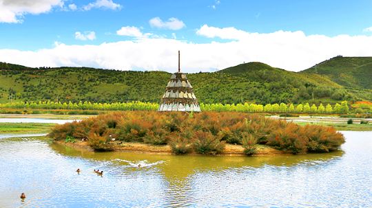入口处乘坐景区环保观光车,约20分钟可抵达属都湖景区。属都湖湖水清澈碧蓝,湖畔是一片绵延的高原牧场,春夏季节,草场上野花盛开,非常漂亮。冬季的清晨,湖面上水汽凝结,像一层白雾弥漫在水面上,只有搭乘清早的第一班车到此,方可观赏到这一奇景。草场沿湖搭建有步行栈道,走完一圈大约需要一个小时。栈道尽头就是环保车站,游玩结束上车抵达下一个目的地。