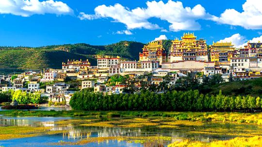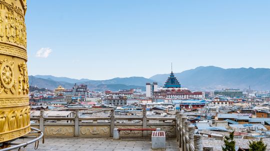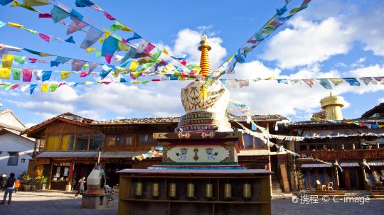 古城的建筑布局犹如八瓣莲花,中心是月光广场,古朴的藏式木屋一幢接一幢环绕在四周,当地百姓在这里平静地生活。广场西侧是大龟山,又称龟山公园,龟山顶上有载入吉尼斯世界纪录的世界大转经筒,要三个人一起用力才能转动。龟山公园西北侧的四方街,每晚的藏族锅庄舞总是能吸引大量游人参与其中,如果恰好遇到,一定要参与到这份快乐中去。