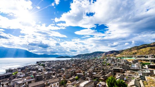 洱海有名的景色是东岸的双廊,这里可以欣赏到优美的湖景,阳光透过云层,折射在湖水上,形成了“洱海神光”,以连绵的青山为背景,是摄影爱好者捕抓的风景大片。