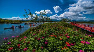 夏天水草丰满,草原上长着小花,羊、牛、马成群吃草,和草原融为一体。秋天的草原一片金黄,雪峰倒映在湖泊中。而到了冬春旱季,湖面缩小甚至干涸,变成大片的沼泽。景区的入口处有座八瓣莲花白塔,这样的塔全世界只有两座,另一座在印度。