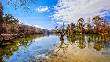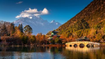 黑龙潭是拍摄玉龙雪山取景的好地方,以五孔桥、得月楼、雪山及黑龙潭中的雪山倒影组成的影像早已成为丽江的经典风光明信片,也是游人在丽江拍照较多的取景地之一。拍玉龙雪山,早上和傍晚拍雪山的光线较好。特别是天晴的时候,蓝天白云和雪山倒映在潭水中,美得像画一样,也因为如此,六七月雨季看到雪山倒影的机会也相对较少。