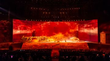 西安华夏文旅大剧院作为华夏文旅西安度假区项目的标志性建筑,设计为一座长142米,宽128米,高约50米的大型椭球体建筑物,可容纳3000人同时观看演出。剧场中央巧妙设计并修建一座可移动观众席,打破了世界单一舞台演出模式,通过旋转行走看台将观众送至观演位置,带给观众全新的视听享受。