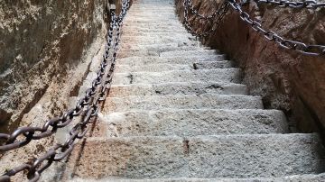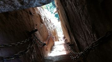 长空栈道位于华山南峰东侧山腰上,是华山派宗师——元代贺志真道长为远离尘世静修成仙,在悬崖绝壁上镶嵌石桩,铺上木板而成。走到栈道尽头,能够看到贺掌门修身的“贺祖洞”。