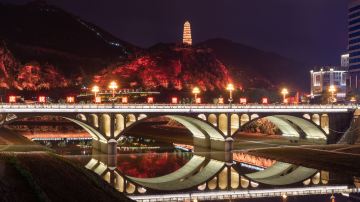 宝塔山下的延河桥,是一座继承和发展了我国古代敞肩式拱桥建筑传统技艺的石拱桥,有着浓郁的民族风格。全桥总长123米,3孔净跨各30米,主拱采用立墙空腹拱的形式,即在每个大跨上设有6个小拱,桥身轻秀,承载力强。宝塔山和延河桥,相谐相辉,已经是延安革命圣地的象征,是城市的标志,更是摄影、绘画的重要景点。