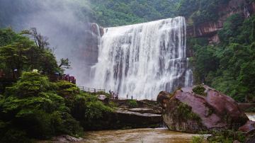 陡坡塘瀑布是黄果树瀑布群里瀑顶最为宽的瀑布,瀑布水沿着瀑面倾泻而下,声势浩大,场面蔚为壮观,令人惊叹。运气好的话还可以看到美丽的彩虹。这里也是86版电视剧《西游记》片尾曲的取景地。