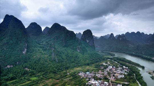 兴坪古镇位于阳朔北部漓江江畔,是一座拥有一千七百多年历史的古镇。如今古镇内仍存有古街、古桥、古戏台、古庙等景物。古镇江边有竹筏漂流的码头,可以坐船前往“黄布倒影”景观,这里也是二十元人民币背面图案的取景地。