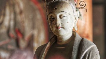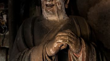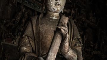 大殿内的殿壁上还塑造了五百罗汉渡江的故事。长达约50米的巨型彩色悬塑,反映了五百罗汉在崇山峻岭间,或是降龙伏虎,或是撼山探海,或是聆听讲经,或是端坐习定,或是脚踩水兽,或是坐船渡海,或是飞行空中的各种形像。当你静静的观赏五百罗汉彩塑时,会有一种上下千年的博大之感。