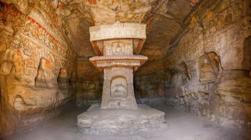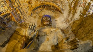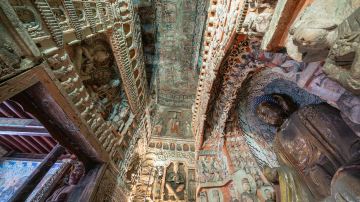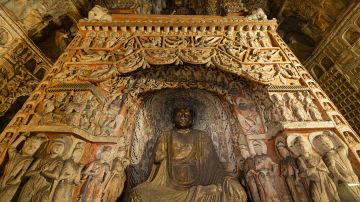 云冈石窟位于大同市城西约16公里的武州(周)山南麓、武州川的北岸,始建于北魏建都平城(今大同)的时代。和后期开凿的洛阳龙门石窟不同的是,云冈石窟不仅有中国传统艺术风格,也融合了古印度、西域和中原各民族的艺术特征。具有代表性的是第20窟(白佛爷洞)高13.75米露天释迦坐像,这尊塑像胸部以上保存得依然完整:面部半圆,深目高鼻,眼大唇薄,保留着典型的西域少数民族、印度人的面部特征。而龙门石窟中的大佛,则已经接近南朝士大夫的相貌了。云冈这尊释迦坐像的衣饰线条也不似龙门石窟那样柔和,而是透着北魏早期艺术的干练。