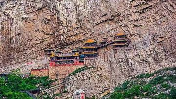 来到恒山脚下,远远地就可以看到悬在半山腰的悬空寺,可谓是万丈深渊上的建筑。整个寺院悬在陡峭的崖壁上,利用峭壁的凹凸部分巧妙依势而建,显得格外错落有致。诗人李白当年游览过悬空寺后,挥笔写下“壮观”二字,写完仍觉得不够体现自己激动的心情,又在“壮”上多加了一点,这两个字至今还刻在寺院脚下的岩石上。