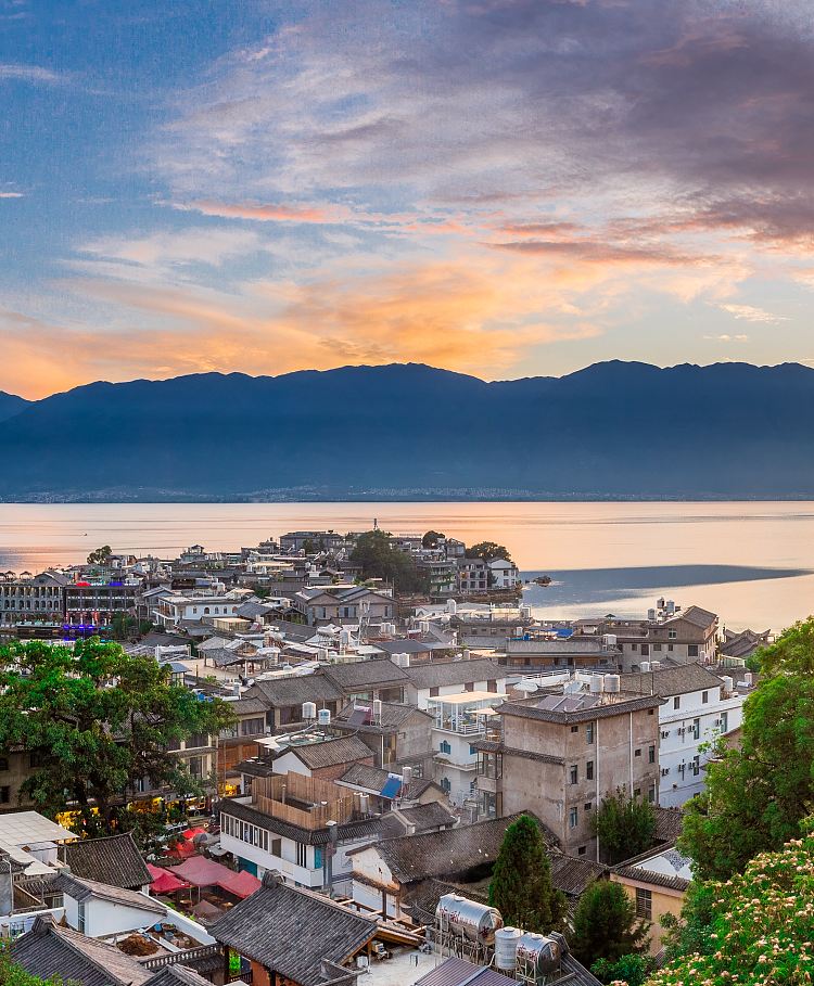 洱海有名的景色是东岸的双廊,这里可以欣赏到优美的湖景,阳光透过云层,折射在湖水上,形成了“洱海神光”,以连绵的青山为背景,是摄影爱好者捕抓的风景大片。