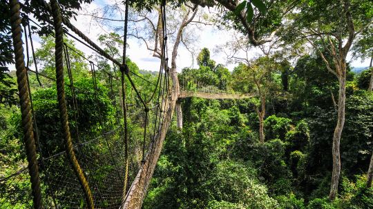 在雨林中可以看到高耸入云的参天大树,高的有80米,相当于20多层楼的高度。你还可以体验惊险刺激的空中走廊,它搭建在几十米高的树上,长约500米。走在走廊上面,俯瞰整片热带雨林景区,壮观且刺激。如果不想体验空中走廊,也可以沿着树丛中的小路蜿蜒前行,零距离探索热带雨林的神秘。