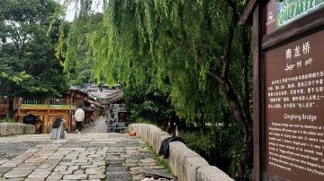 青龙桥位于束河古镇内,建于明朝万历年间,至今已经有400多年的历史,几百年的岁月洗礼使它变得古朴苍桑,桥石间生长了杂草,显得有一些斑驳苍老,但却依然保持着庄严厚重的感觉。