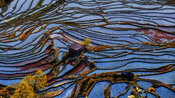 多依树景区包括多依树、爱春、大瓦遮等连片上万亩梯田,像版画一样连绵壮观。尤其是日出的时候,朝阳的光辉在梯田水面上跳跃,变幻出多样的色彩。