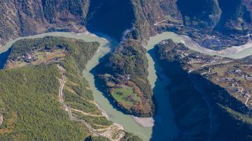 在距丽江城区约50公里的石鼓镇,滚滚长江被山崖阻挡,急转成一个“Ⅴ”形大弯,这就是有名的长江第一湾。这里的江水平缓如镜,两岸是江南水乡一般的青山、整齐划一的农田和村镇,高原上有这番景致,令人称奇。