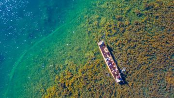 猪槽船由一根粗壮的镂空圆木,两头削尖制成,因其看起来像一只长长的猪槽而得名。泸沽湖湖水碧蓝清澈,藻花点缀其间,湖中仅有的交通工具是摩梭人特有的“猪槽船”。