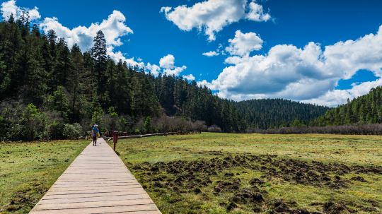 属都湖岸边是一片高原草场,春夏野花盛开,秋天层林尽染,景色很美。草场有一条沿湖栈道,乘环保车到这里之后,可以在栈道上漫步、拍照、享受自然风光,非常惬意。栈道尽头是环保车站,结束属都湖的游览,便可乘车继续前往下一个景点弥里塘草原了。