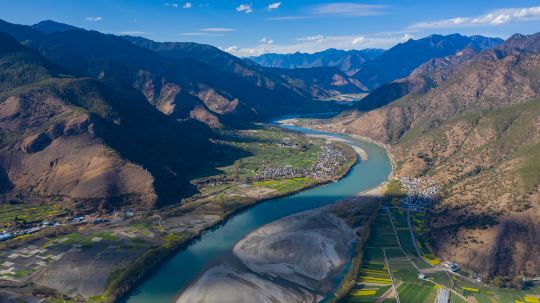 从中虎跳沿着公路前行,经过山体松动滚石连连的“滑石板”,眼前忽然一片开阔,江面变得开阔,江水趋于平缓,宛如峡谷中出现了一个巨大的水库,这里就是下虎跳。远处阡陌纵横,炊烟袅袅,已是丽江市的大具乡了。