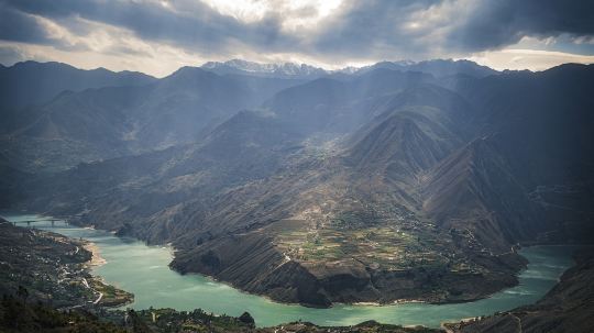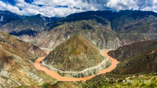 穿山越谷而来的金沙江,由此水势更加浩荡,峡谷逐渐开阔,在即将冲出这川滇要塞之时,它似乎想先舒缓一下长途奔波的疲劳,于是放慢脚步,围绕着金字塔般的日锥峰潇洒地画了一个“Ω”字形的大拐弯。孰料这不经意的即兴之作,竟成就了一处奇观。