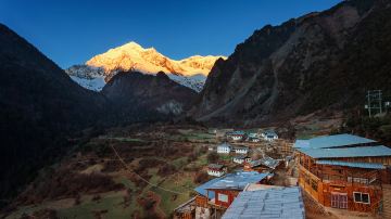 一个四面群山簇拥,中间有一块略微平坦的田园村庄,分上下两个自然村,约有四十几户人家。雨崩村有上下村之分,上雨崩村可以通往攀登卡瓦格博的中日联合登山大本营,而下村通往雨崩神瀑,沿途可以看到古篆天书、五树同根的奇景。