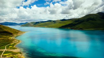 夏天水草丰满,草原上长着小花,羊、牛、马成群吃草,和草原融为一体。秋天的草原一片金黄,雪峰倒映在湖泊中。而到了冬春旱季,湖面缩小甚至干涸,变成大片的沼泽。景区的入口处有座八瓣莲花白塔,这样的塔全世界只有两座,另一座在印度。