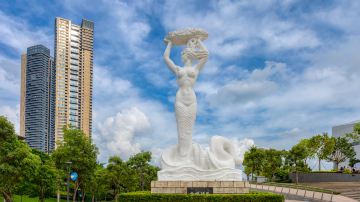 珠海渔女雕像矗立在珠海风景秀丽的香炉湾畔,雕像身高约8.7米,由70余块花岗岩打造,是珠海的标志性景观。她领戴珍珠、身掮渔网,双手高擎着一颗浑圆硕大的珍珠状宝物,令人怜爱的神情栩栩如生。