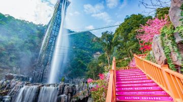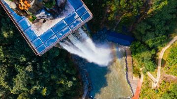 云门山云上飞瀑瀑布出水口宽8米,从顶端直流而下,一泻到底,其落差达168米,相当于五十层楼的高度,从远望去,百米瀑布倾泻而下,颇为壮观,瀑布内安装有3台观光电梯,每台观光电梯可同时容纳13人,是国内罕见的瀑布与电梯组合游玩项目,瀑布顶部设有80米长的观光平台供游客观景,站在观光平台上,可以直接俯瞰谷底的无限美景。