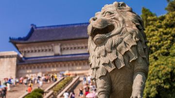 到达中山陵顶需要爬长长的台阶,每过一段台阶会有一块平台以便歇脚。这里有一个设计上的视觉手法,使你自下而上看时,只见台阶不见平台,自上而下看时,只见平台不见台阶,你不妨留心一观。在第五个平台上有两个大鼎,其中一个鼎壁上还留有日军侵华时造成的炮弹孔。