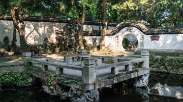 出牌坊区,接着参观院内的园林。荷花池四周有好几个赏荷的亭子,每个造型都不一样。水面上还有一座五曲桥,造型优美。走过五曲桥,便是后花园了。这里有许多太湖石围城的假山、小品,走出后花园,你会看到一株百年紫藤树,取“紫气东来”的含义,被视作大富大贵的象征。游人路过此处,必伸手摸一摸沾沾福气。