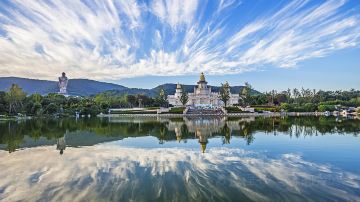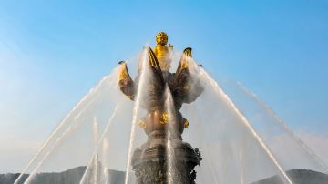 更难得的是,灵山胜境的大型音乐动态群雕“九龙灌浴,花开见佛”再现了故事中的绚丽景象。在九龙灌浴广场,我们可以看到一座含苞待放的巨大莲花铜雕矗立在前方,巨大的荷花由四个威武的大力士托起,底部衬托着白色的圆形大理石水池,九条飞龙和八个形态各异的供养人环绕着巨大的水池。