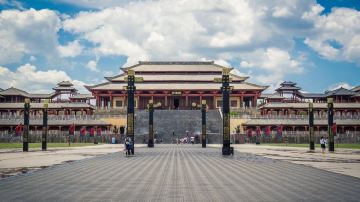 灵山梵宫的外观以华藏塔风格为主,并融合了石窟与传统佛教建筑元素,大块的石板外墙上布满了精美的浮雕,五个金色尖顶非常大气。走进宫殿,殿内的东阳木雕、敦煌壁画、扬州漆器、景泰蓝须弥灯、寿山石雕、景德镇青花斗彩缸等艺术珍品让人目不暇接。宽敞的大厅四处金碧辉煌,你会看到人形的十二生肖金像,各个坐姿不同,神态逼真。来到中庭,精雕细琢的高大穹顶气派非凡,蓝色的顶端宛如苍天;前方梁柱上有不同形态的仙人雕像,仿佛就要飞出来一般。