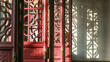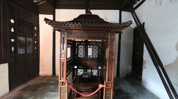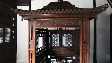张厅的一进是门厅;二进是轿厅,也称茶厅,供主人接待轿夫、船夫等一般的客人所用,厅中有一块天然大理石照壁,上面的纹理像一幅山水画。三进是正厅玉燕堂,用于举办婚丧庆典和接待贵宾,厅内摆着明式家具,屋顶正梁角落里各有两块突出的椭圆形雕花板,像古代官帽上的帽翅,这正是官宅特点的反映,所以这个厅也叫纱帽厅。